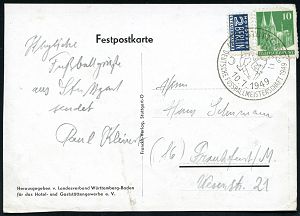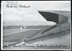 3199 | 30 € | 7000 Stuttgart Sonder- & Hand-Werbestempel : (14a) STUTTGART/ DEUTSCHE FUSSBALLMEISTERSCHAFT 1949 (10.7.) SSt = 2 Spieler mit Ball klar auf seltener s/w.-Foto-Sonder-Kt. "Gruß aus Stuttgart".. Deutsche Fußballmeisterschaft = Stadion (Michaelis Nr.6, + 40.-DM, 1991) Bedarf (Bo.117) | ![]() ![]() | |