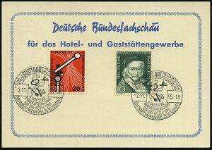 3213 | 18 € | 7000 Stuttgart Sonder- & Hand-Werbestempel : (14a) STUTTGART/ HÖHENPARK/ KILLESBERG/ 6.DEUTSCHE/ BUNDESFACHSCHAU/ ..HOTEL- UND/ GASTSTÄTTENGEWERBE 1955 (2.11.) SSt = stilis. Koch als Schlüssel (mit Kochlöffel, Tablett) 2x klar rs. auf Ausl.-Sonder-Kt.! (Bo.206) | ![]() | |