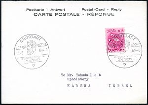 3223 | 16 € | 7000 Stuttgart Sonder- & Hand-Werbestempel : 7 STUTTGART/ JSRAEL WOCHE/ Dr.THEODOR HERZL 1969 (19.3.) hebräisch-deutscher SSt (Kopfbild Herzl) auf israel. Frankatur, zulässige Ausl.-Antwort-Kt. n. Israel!, seltene Verwendung! (Bo.440) | ![]() | |