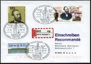 3234 | 18 € | 7000 Stuttgart Sonder- & Hand-Werbestempel : 70173 STUTTGART 1/ 100.Todestag Heinrich v.Stephan.. 1997 (7.5.) SSt = Heinr. v. Stephan 3x auf 120 Pf. UPU-Kongreß (H. v. Stephan) u. 100 Pf. H. v. Stephan (Mi.1217, 1912) u. ATM 230 Pf. + Selbstklebe-RZ: 70173 Stuttgart 1/ c p , Inl.-R-Bf., seltene Kombination! | ![]() | |