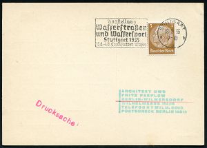 3173 | 12 € | 7000 Stuttgart Sonder- & Hand-Werbestempel : STUTTGART/ *1b/ Ausstellung/ Wasserstraßen/ u.Wassersport/ 15.6.-4.8. 1935 (13.5.) MWSt , klar auf Inl.-Drs.-Kt. (Bo.44 A I) | ![]() | |