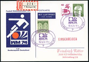 3227 | 20 € | 7000 Stuttgart Sonder- & Hand-Werbestempel : 7 STUTTGART 50/ WM74/ FIFA Wolrd Cup/ a 1974 (15.6.) violetter SSt (WM-Logo) auf PP 40 Pf.+ 30 Pf.: WM74 (Mi.PP 56) + Zusatzfrankatur, Inl.-Flp.-R-Karte! | ![]() | |