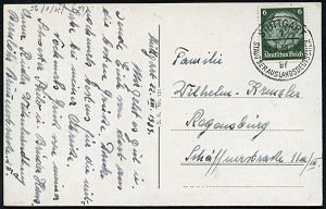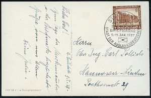 3177 | 18 € | 7000 Stuttgart Sonder- & Hand-Werbestempel : STUTTGART 1/ SDA/ WERBE-/ AUSSTELLUNG/ ZUM TAG DER/ BRIEFMARKE 1937 (Jan.) SSt auf EF 25 Pf. Hindenbg. (Mi.522 EF) portorichtiger Ausl.-Bf. (Bo.55) | ![]() | |