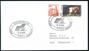 3232 | 8 € | 7000 Stuttgart Sonder- & Hand-Werbestempel : 7000 STUTTGART 50/ 6.Fußball-Europameisterschaft 1988 (12.6.) SSt (Logo) auf passender Frankatur 60 + 30 Pf. Fußball-EM u.a., Inl.-Bf. (Mi.1353 u.a.) | ![]() | |