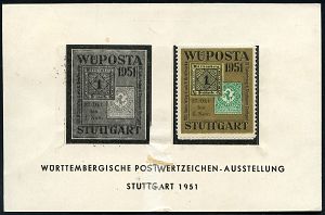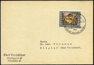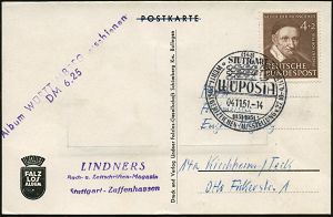 3207 | 20 € | 7000 Stuttgart Sonder- & Hand-Werbestempel : (14a) STUTTGART/ WÜPOSTA/ 1851.. 1951 (4.11.) SSt auf EF 4 + 2 Pf. Wofa St. Vinzenz (Mi.143 EF ,+ 40.-EUR) auf Lindner-Reklamekt.: WÜPOSTA (Michaelis unbekannt!) rs. Klarsichthülle m. Ausstellungs-Vignette. (Schürfung, Schrift ergänzt) Inl.-Drs.-Karte (Bo.152) | ![]() ![]() | |