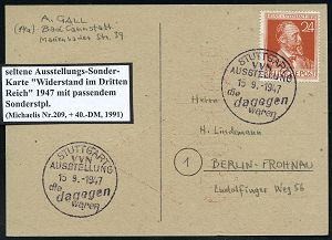 3195 | 30 € | 7000 Stuttgart Sonder- & Hand-Werbestempel : STUTTGART/ VVN/ AUSSTELLUNG/ die/ dagegen/ waren 1947 (15.9.) schw.-viol. SSt klar auf Ausstellungs-Sonderkarte mit Hakenkreuz u. KZ-Winkel (Michaelis Nr.3, + 40.-DM, 1991) seltene Fern-Kt. (Bo.105) | ![]() ![]() | |