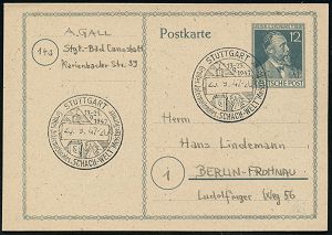 3196 | 25 € | 7000 Stuttgart Sonder- & Hand-Werbestempel : STUTTGART/ Großes Jnternationales "SCHACH-WELT" Meister-Turnier 1947 (21.9.) SSt = Springer, Schachbrett 2x klar auf Inl.-Karte n. West-Berlin (Bo.107) | ![]() | |