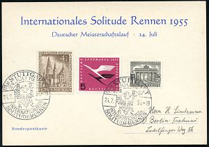 3211 | 20 € | 7000 Stuttgart Sonder- & Hand-Werbestempel : (14a) STUTTGART/ ADAC/ INTERNAT./ SOLITUDERENNEN 1955 (21.7.) SSt (ADAC-Adler) klar auf 4 + 1 Pf. Berlin Gedächtniskirche (Mi.106 u.a. + 25.- EUR) Inl.-Sonder-Kt. = Deutscher Meisterschaftslauf notopferbefreit n. West-Berlin (Bo.202) | ![]() | |