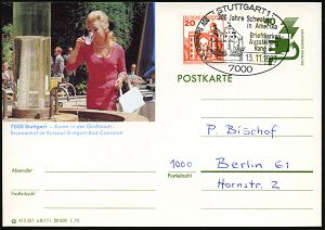 3210 | 12 € | 7000 Stuttgart Sonder- & Hand-Werbestempel : (14a) STUTTGART-BAD CANNSTATT/ BESUCHT DIE WILHELMA 1964 (26.1.) HWSt = Elefant (mit Blumen) auf Orts-P 8 Pf. Posthorn (Mi.P 11 II, + 7.- EUR) Bedarf (Bo.164, Type I) | ![]() | |