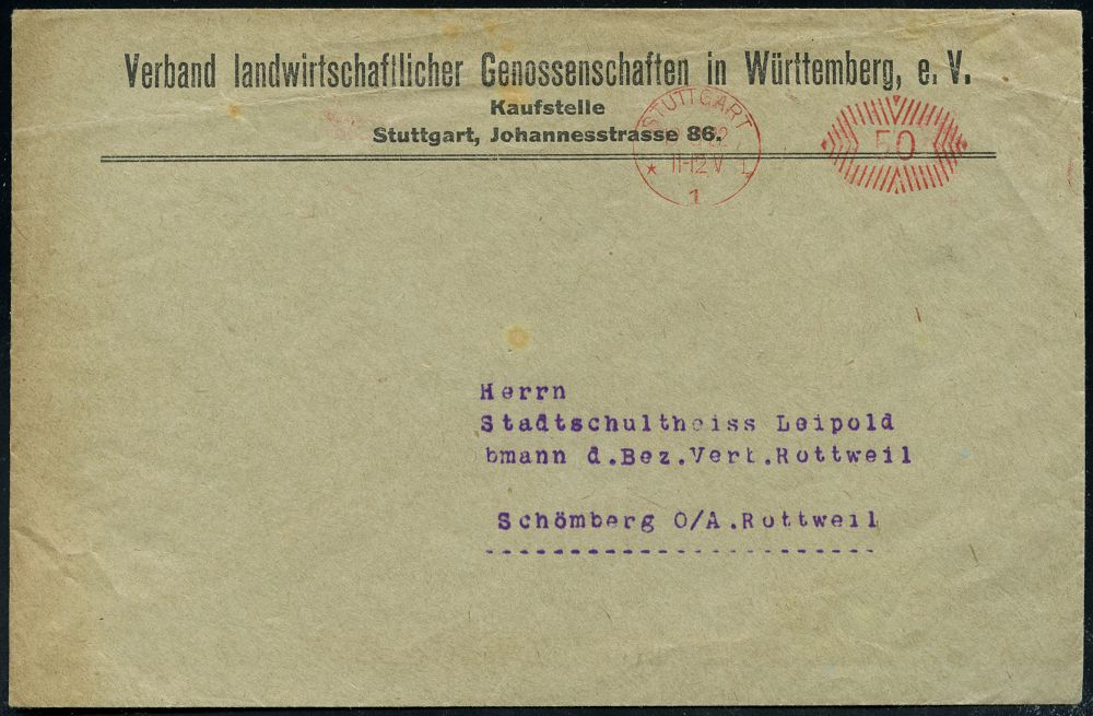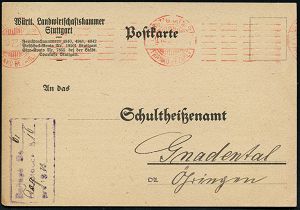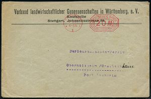 3448 | 15 € | 7000 Stuttgart Maschinen-Postfreistempel : STUTTGART 1 1922 (19.8.) roter Infla-PFS "Ziermuster" 50 Pf. auf Vordr.-Bf.: Verband landwirtschaftl. Genossenschaften in Württemberg e.V. (Dü.D-1, Nr.11) | ![]() | |