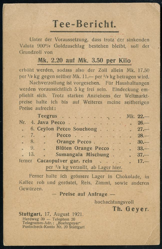 3445 | 16 € | 7000 Stuttgart Maschinen-Postfreistempel : STUTTGART/ *1I 1921 (12.9.) roter Infla-Ziermuster-PFS 10 Pf. auf Reklame-Kt.: TH. GEYER Tee-Versand (Preisliste mit Tee-Sorten) Orts-Drs.-Kt. (Dü.D-1, Nr.7) | ![]() ![]() | |