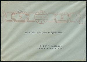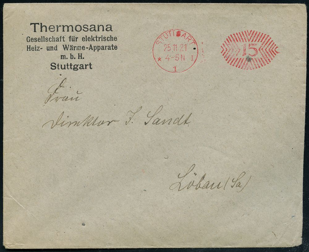 3446 | 15 € | 7000 Stuttgart Maschinen-Postfreistempel : STUTTGART/ *1I 1921 (25.11.) roter Infla-Ziermuster-PFS 15 Pf. auf Firmen-Bf.: Thermosana, Gesellschaft für elektrische Heiz- u. Wärme-Apparate.. n. Löbau (Dü.D-1, Nr.8) | ![]() | |