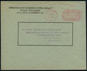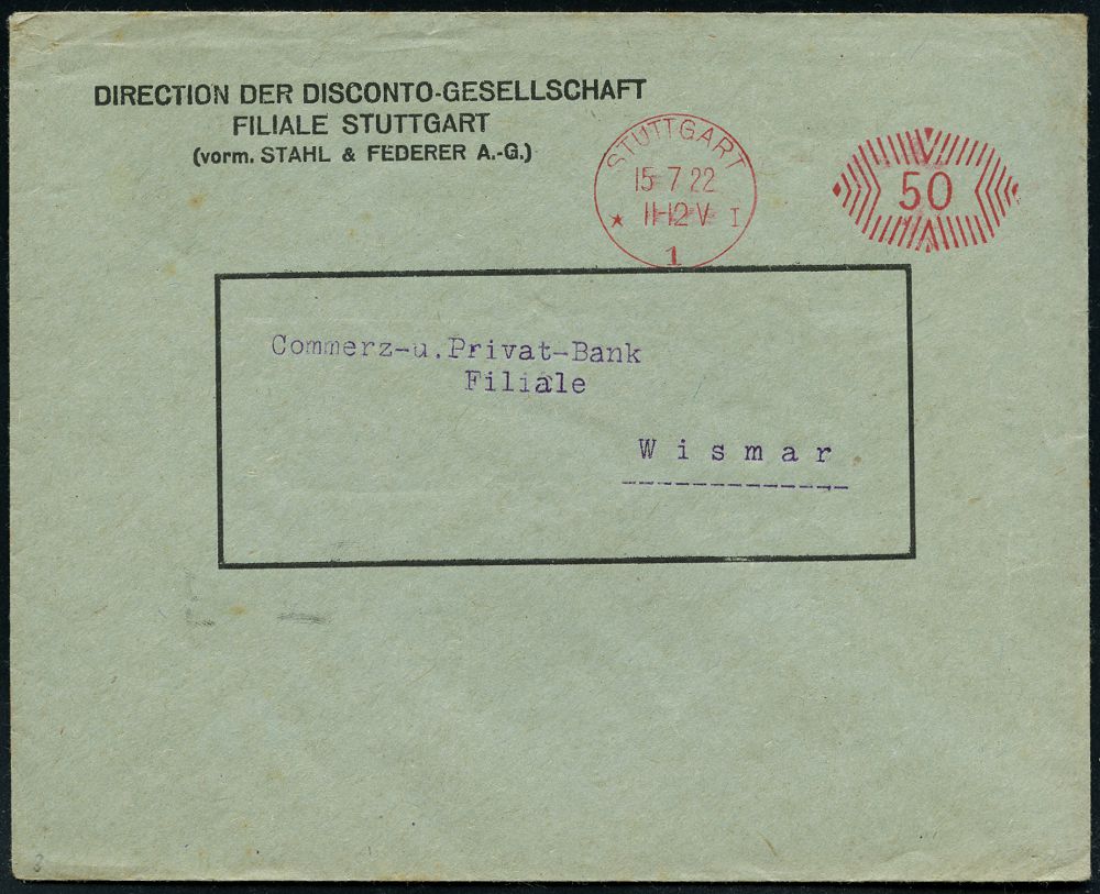 3447 | 15 € | 7000 Stuttgart Maschinen-Postfreistempel : STUTTGART/ *1I/ 50 1922 (15.7.) roter Infla-Ziermuster-PFS 50 Pf. auf Firmen-Fern-Bf.: DIRECTION DER DISCONTO-GESELLSCHAFT.. (Dü.D-1, Nr.11) | ![]() | |