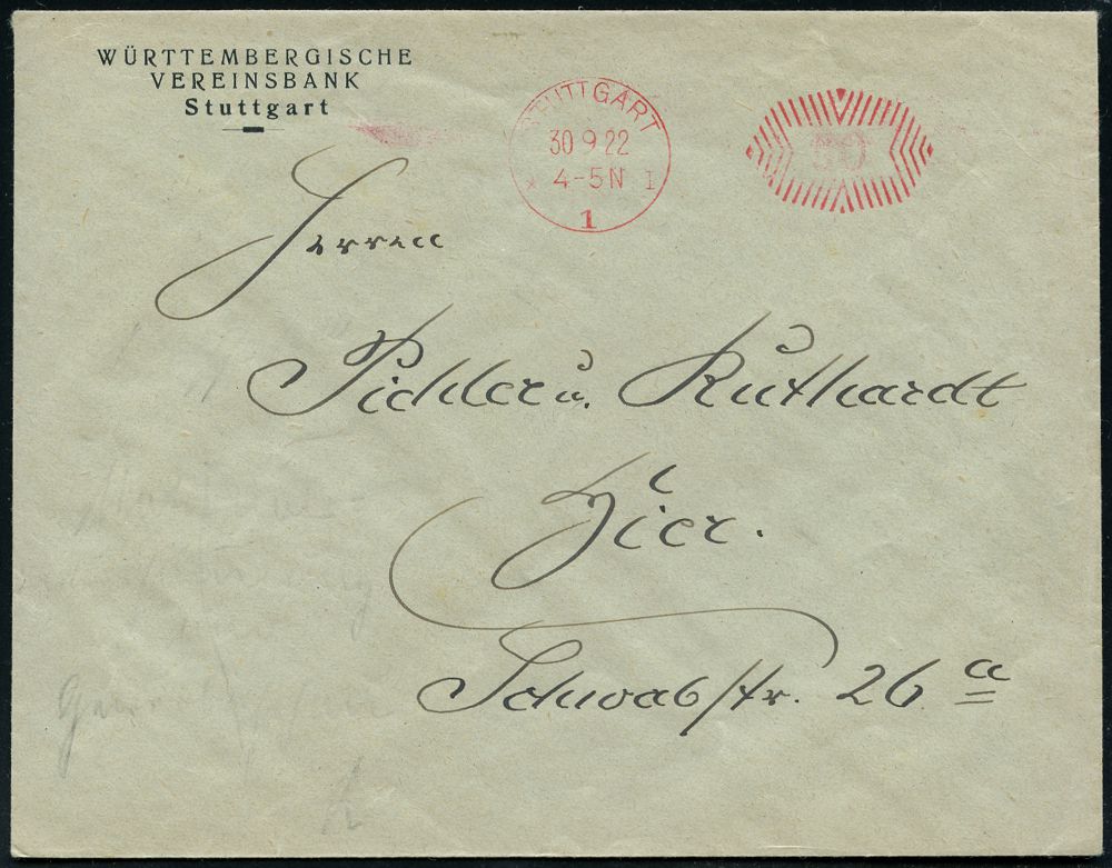 3449 | 14 € | 7000 Stuttgart Maschinen-Postfreistempel : STUTTGART/ *1I/ 50 1922 (30.9.) roter Infla-Ziermuster-PFS 50 Pf. auf Firmen-Bf.: WÜRTTEMBERGISCHE VEREINSBANK.. (Dü.D-1, Nr.11) | ![]() | |