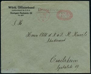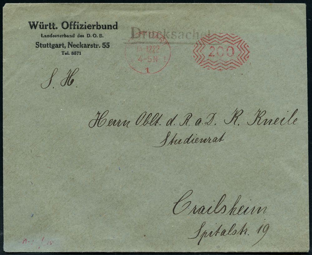 3451 | 25 € | 7000 Stuttgart Maschinen-Postfreistempel : STUTTGART/ *1I/ 200 1922 (14.12.) roter Infla-Ziermuster-PFS 200 Pf. auf Vordruck-Bf.: Württ. Offiziersbund, Landesverband des D.O.B... (Dü.D-1, Nr.18) | ![]() | |
