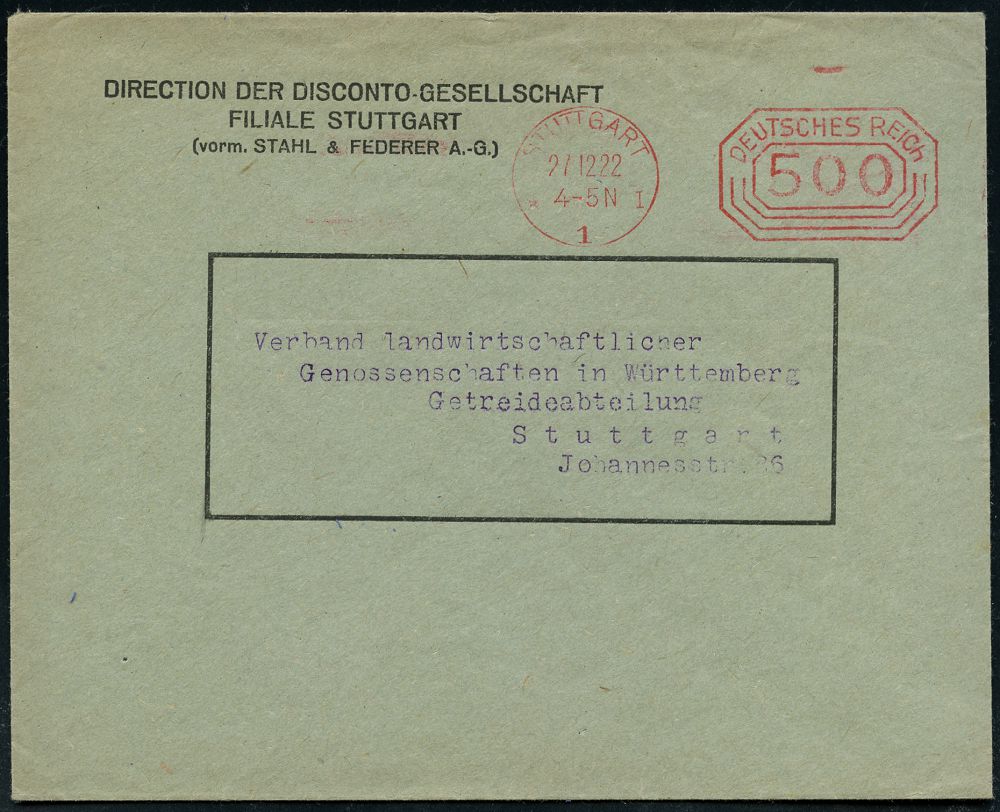 3452 | 15 € | 7000 Stuttgart Maschinen-Postfreistempel : STUTTGART/ *1I/ DEUTSCHES REICH 1922 (21.12.) Infla-PFS "Achteck" 500 Pf. auf Firmen-B.: DIRECTION DER DISCONTO-GESELLSCHAFT.. (Dü.D-3, Nr.36) | ![]() | |