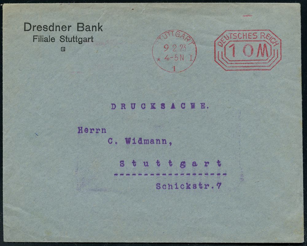 3453 | 14 € | 7000 Stuttgart Maschinen-Postfreistempel : STUTTGART/ *1I/ DEUTSCHES REICH 1923 (9.2.) Infla-PFS "Achteck" 10 M(ark) auf Firmen-Orts-Bf.: Dresdner Bank.. (Dü.D-3, Nr.39) | ![]() | |