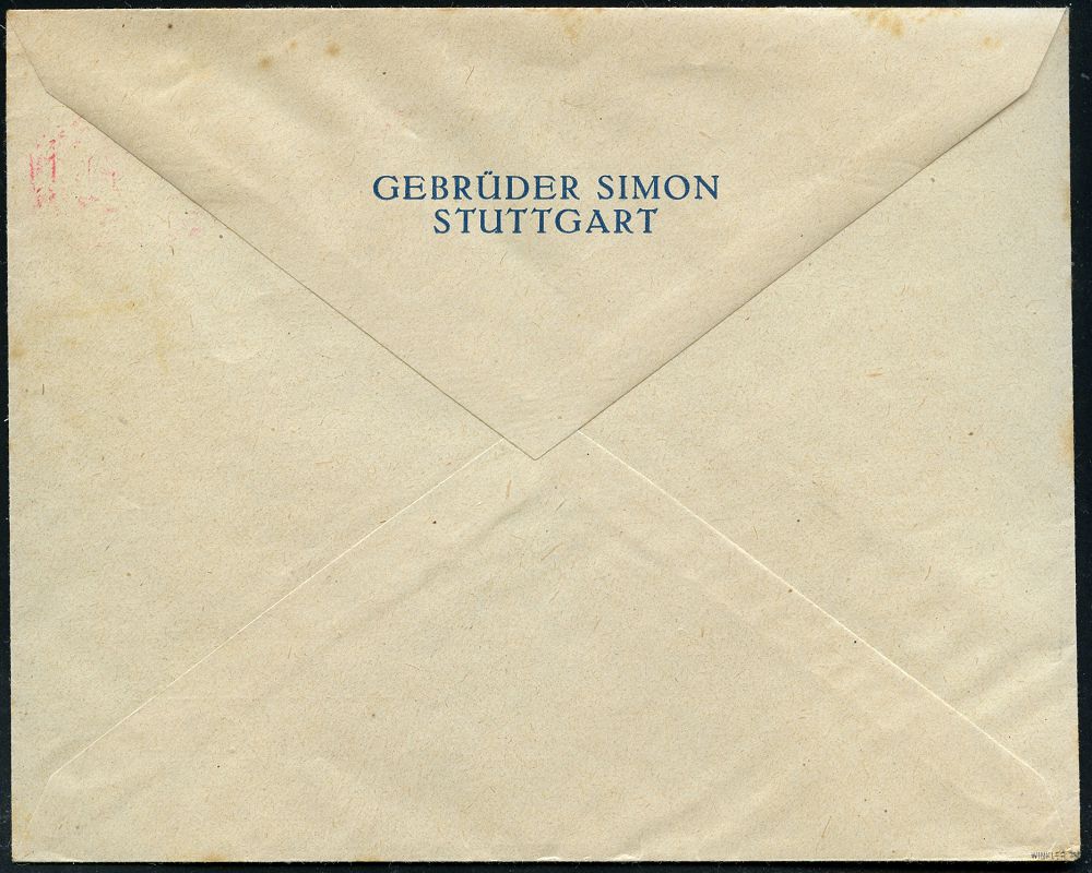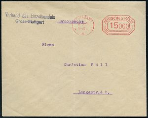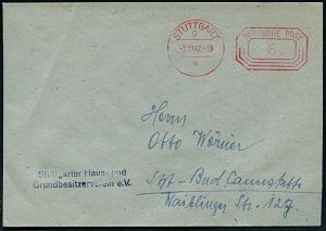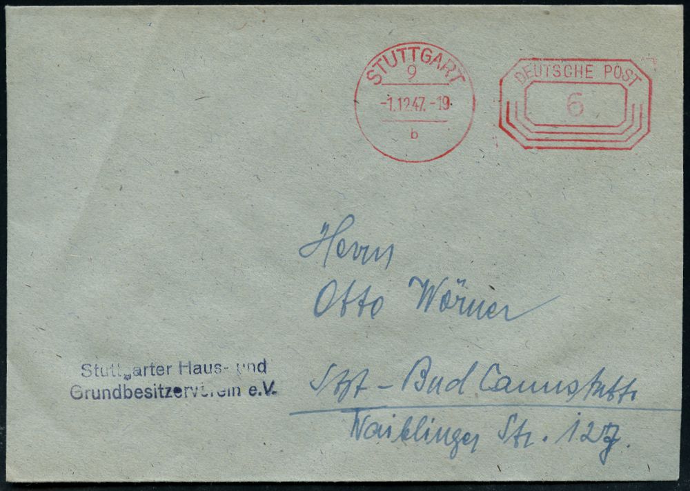3527 | 8 € | 7000 Stuttgart Maschinen-Postfreistempel : STUTTGART/ 9/ b/ DEUTSCHE POST 1947 (1.12.) aptierter PFS "Achteck", 6 Pf. Inschrift "STADT DER AUSLANDSDEUTSCHEN" entfernt , bl. 2L: Stuttgarter Haus- u./Grunsbesitzerverein e.V., Orts-Bf. (Dü.D-11) | ![]() | |