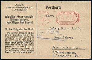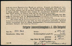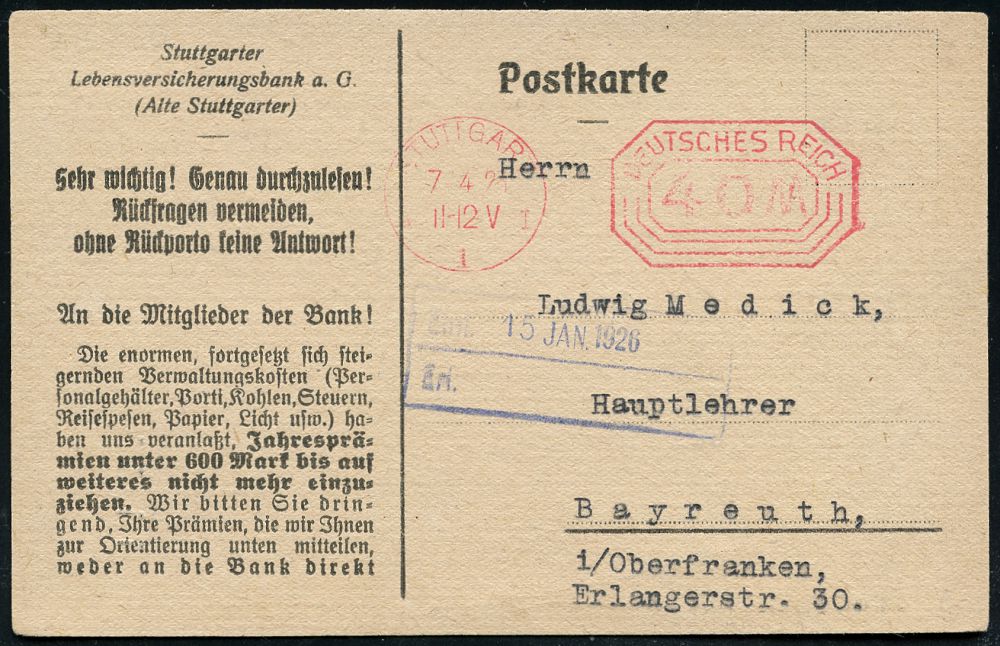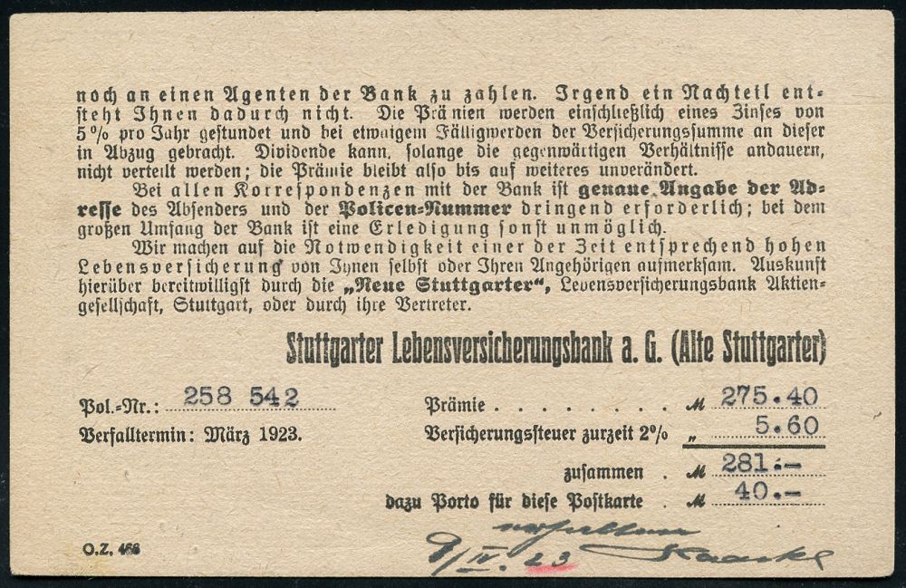 3456 | 18 € | 7000 Stuttgart Maschinen-Postfreistempel : STUTTGART/ *1I/ DEUTSCHES REICH 1923 (7.4.) Infla-PFS "Achteck" 40 M(ark) auf Firmen-Kt.: Stuttgarter Lebensversicherungsbank a. G. n. Bayreuth (Dü.D-3, Nr.50) | ![]() ![]() | |