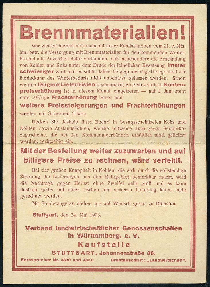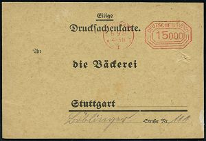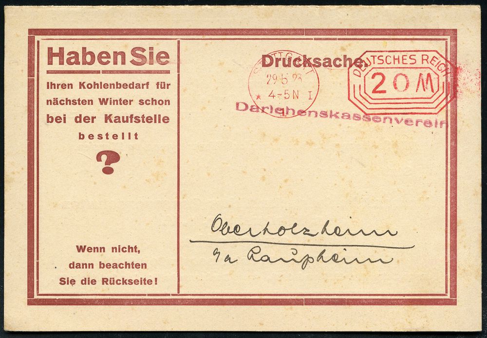 3457 | 15 € | 7000 Stuttgart Maschinen-Postfreistempel : STUTTGART/ *1I/ DEUTSCHES REICH 1923 (29.5.) Infla-PFS "Achteck" 20 M(ark) auf Reklame-Klapp-Kt.: Verband landwirtschaftl. Genossenschaften.. (vs. schwach stockig) mit Hinweis auf steigende Preise für Brennmaterialien (Dü.D-3, Nr.44) | ![]() ![]() | |