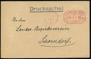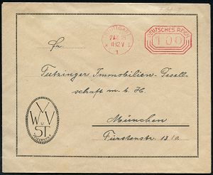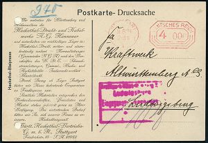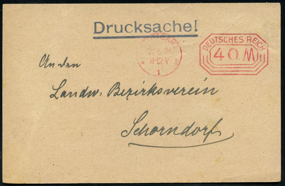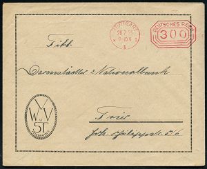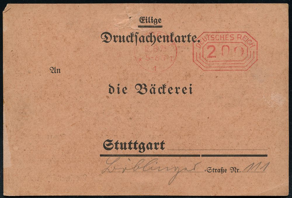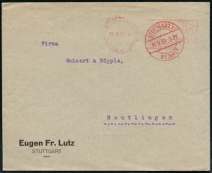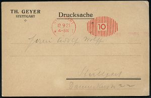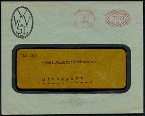 3450 | 25 € | 7000 Stuttgart Maschinen-Postfreistempel : STUTGGART/ *1I/ 200 1922 (13.12.) roter Infla-Ziermuster-PFS 200 Pf. auf Firmen-Bf.: V W u V ST. (Dü.D-1, Nr.18) | ![]() | |