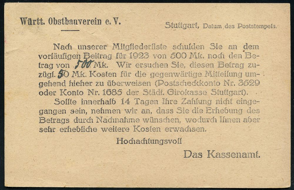 3458 | 16 € | 7000 Stuttgart Maschinen-Postfreistempel : STUTTGART/ *1I/ DEUTSCHES REICH 1923 (2.6.) Infla-PFS "Achteck" 40 M(ark) auf Vordr.-Kt.: Württ. Obstbauverein e. V. über Gebühren n. Schorndorf (Dü.D-3, Nr.50) | ![]() ![]() | |