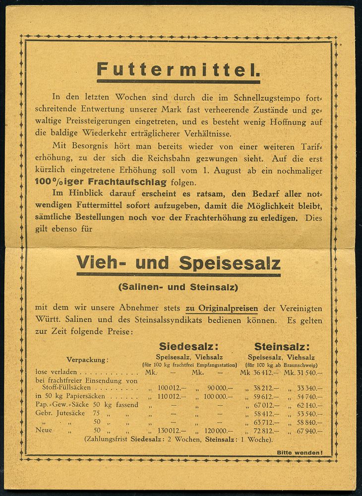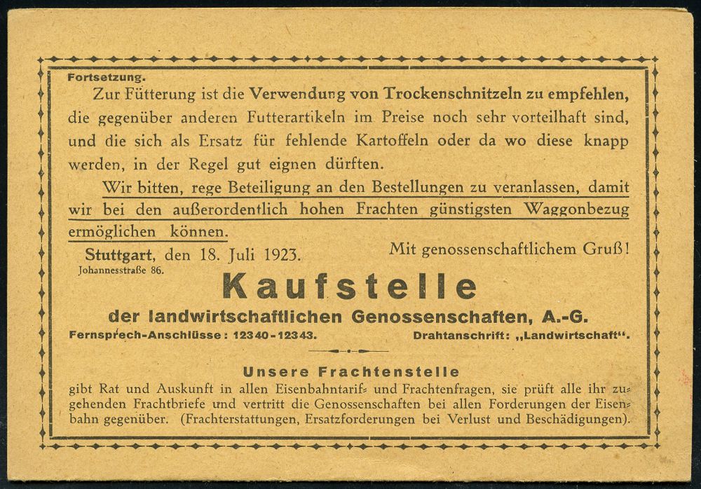 3462 | 18 € | 7000 Stuttgart Maschinen-Postfreistempel : STUTTGART/ *1I/ DEUTSCHES REICH 1923 (21.7.) Infla-PFS "Achteck" 60 M(ark) auf Reklame-Kt.: Landwirtschaftl. Genossenschaften AG. mit Preisliste auf Vieh- u. Speise-Salz (Dü.D-3, Nr.53) | ![]() ![]() ![]() | |