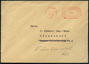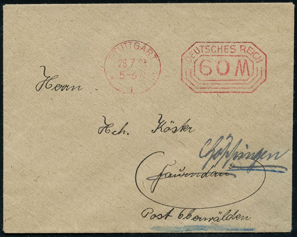 3490 | 25 € | 7000 Stuttgart Maschinen-Postfreistempel : STUTTGART 9/ a/ DEUTSCHES REICH 1933 (5.5.) PFS "Achteck" 4 Pf. (zweizeilig) mit k o p f s t e h e n d e m Wertrahmen! , nachgesandter Fern-Bf. (Dü.D-4, Abart) | ![]() | |