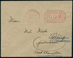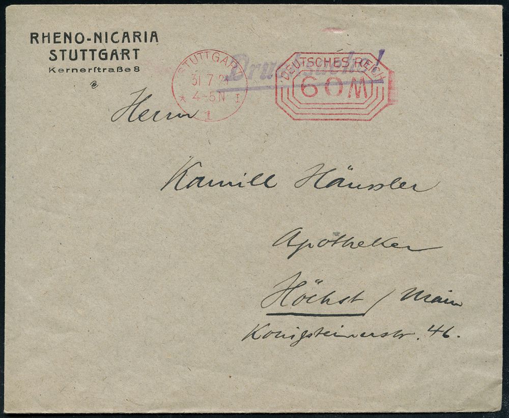3465 | 14 € | 7000 Stuttgart Maschinen-Postfreistempel : STUTTGART/ *1I/ DEUTSCHES REICH 1923 (31.7.) Infla-PFS 60 M(ark) auf Firmen-Bf.: RHENO-NICARIA.. (Dü.D-3, Nr.53) | ![]() | |