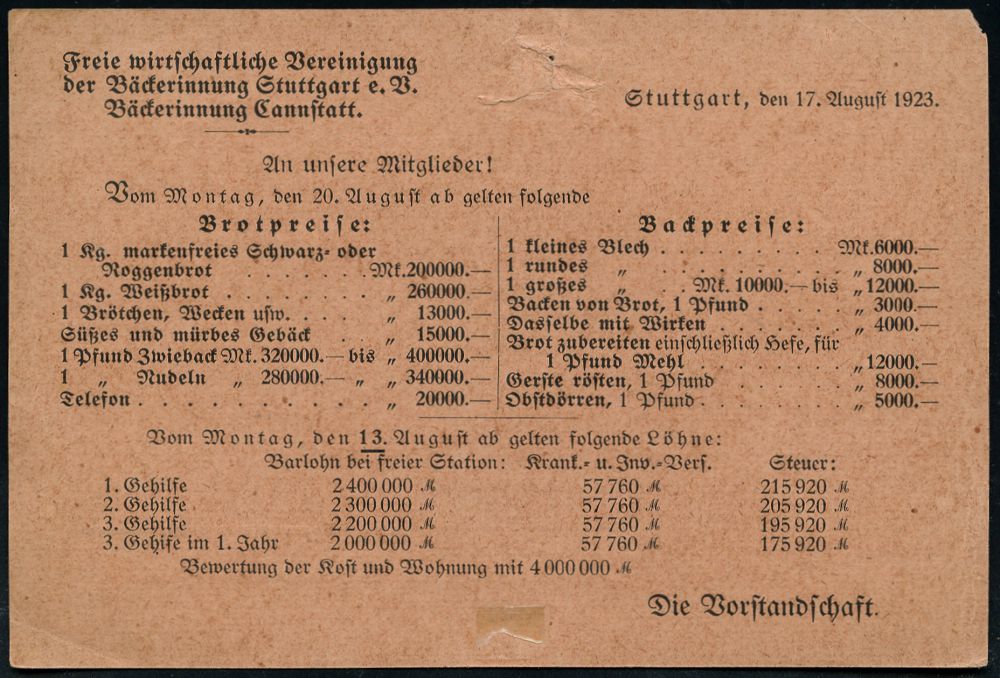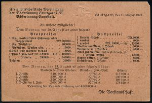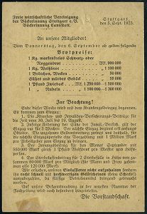 3466 | 15 € | 7000 Stuttgart Maschinen-Postfreistempel : STUTTGART/ *1I/ DEUTSCHES REICH 1923 (18.8.) Infla-PFS 200 (Mark) auf Vordruck-Kt.: Freie wirtschaftl. Vereinigung der Bäckerinnung.. (oben Kerbe) mit Infla-Preisen von Backwaren, z. B. Brötchen 13.000.- MK., 1 kg. Roggenbrot 2 Mio. Mark ! etc., Zeitgeschichte! (Dü.D-3, Nr.62) | ![]() ![]() | |