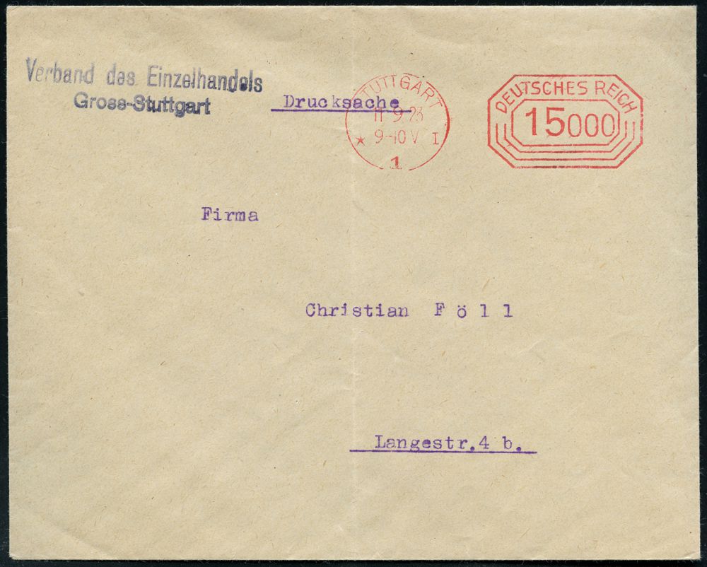 3470 | 14 € | 7000 Stuttgart Maschinen-Postfreistempel : STUTTGART/ *1I/ DEUTSCHES REICH 1923 (11.9.) Infla-PFS "Achteck" 15ooo (Mark) + Abs.-2L: Verband des Einzelhandels.., Orts-Bf. (Dü.D-3, Nr.88) | ![]() | |