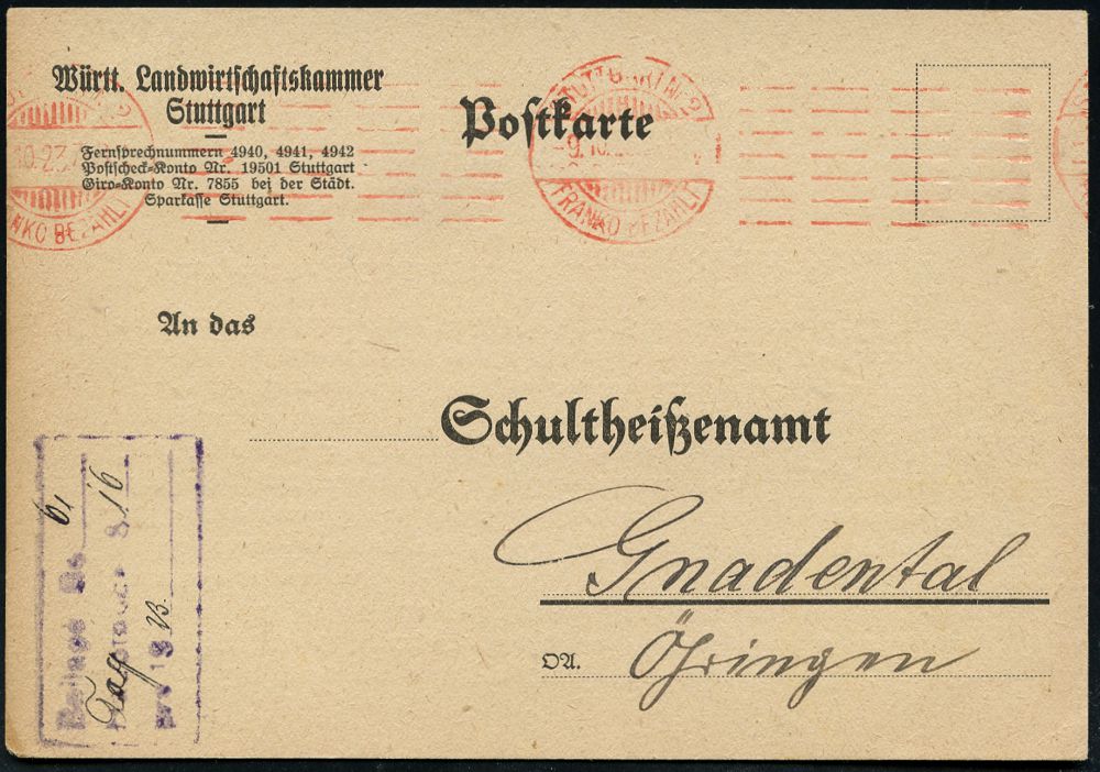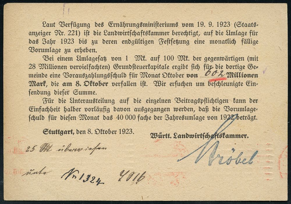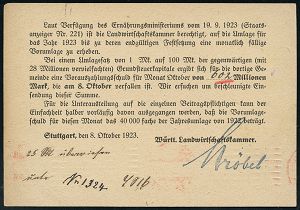3471 | 25 € | 7000 Stuttgart Maschinen-Postfreistempel : STUTTGART Nr.2/ FRANKO BEZAHLT 1923 (9.10.) seltener Infla-Band-Maschinen-PFS mit 4 x 7 kurzen Strichen auf Dienst-Kt.: Württ. Landwirtschaftskammer Stuttgart über inflations-bedingten Summe über 602 Millionen Vorauszahlungsgeld = Zeitgeschichte! (Dü.C-2, Nr.32) | ![]() ![]() | |