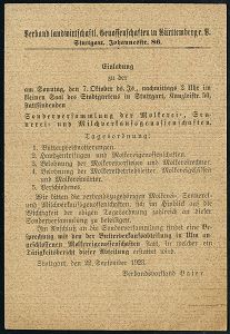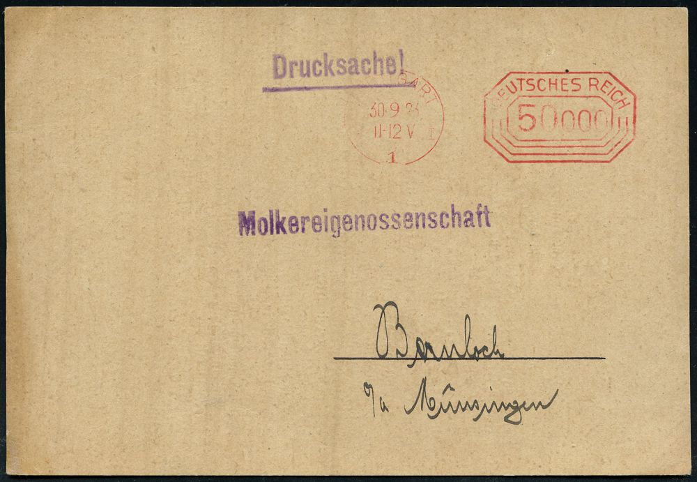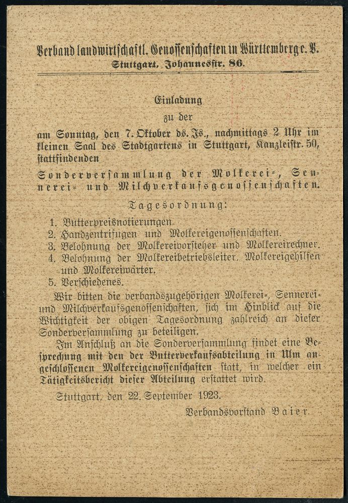 3472 | 18 € | 7000 Stuttgart Maschinen-Postfreistempel : STUTTGART/ *1I/ DEUTSCHES REICH 1923 (30.9.) Infla-PFS "Achteck" 50 ooo (Mark) auf Einladungs-Kt.: Verband landwirtschaftl. Genossenschaftn.. zum Vortrag über Molkerei u. Milchverwertung (Dü.D-3, Nr.99) | ![]() ![]() | |