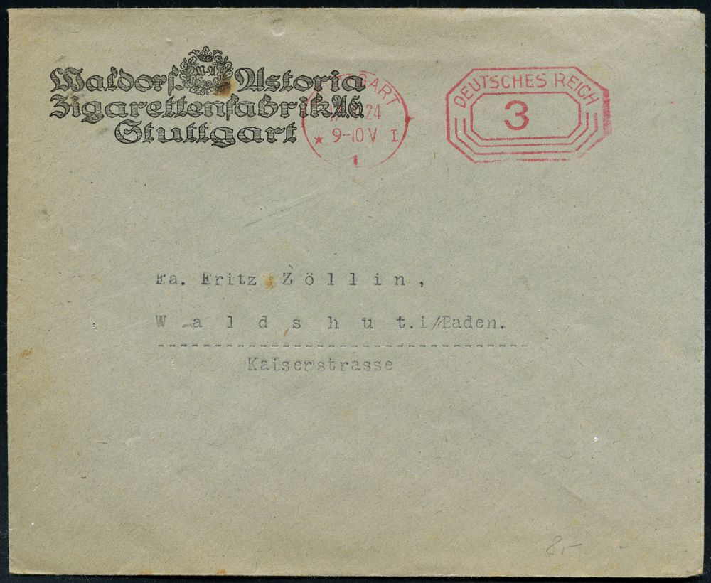 3473 | 10 € | 7000 Stuttgart Maschinen-Postfreistempel : STUTTGART/ *1I/ DEUTSCHES REICH 1924 (17.1.) PFS "Achteck" 3 Pf. auf Firmen-Bf.: Waldorf Astoria Zigarettenfabrik AG. (kl. Fleckchen) mit Firmenwappen (Dü.D-4) | ![]() | |