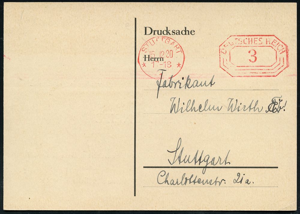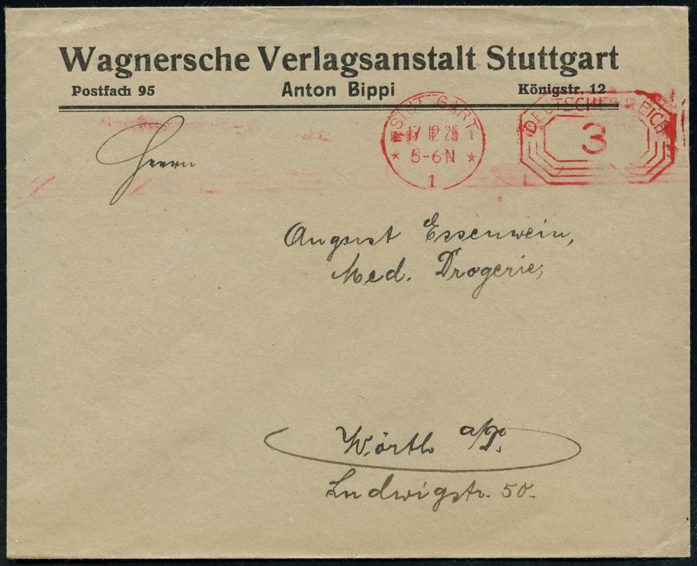 3474 | 8 € | 7000 Stuttgart Maschinen-Postfreistempel : STUTTGART/ *1*/ DEUTSCHES REICH 1925 (17.12.) PFS "Achteck" 3 Pf. auf Firmen-Bf.: Wagnersche Verlagsanstalt.. Anton Bippi (Dü.D-4) | ![]() | |