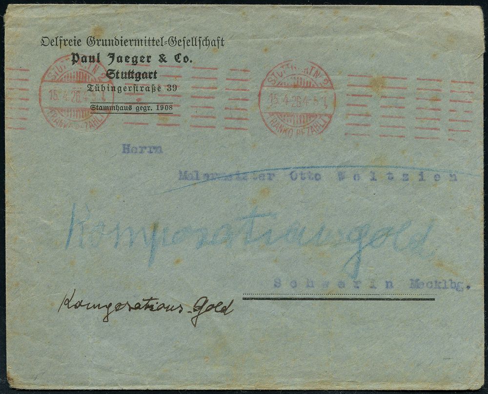 3475 | 25 € | 7000 Stuttgart Maschinen-Postfreistempel : STUTTGART Nr.2/ FRANKO BEZAHLT 1926 (15.4.) seltener Band-PFS ohne Wertangabe mit 4 x 7 Strichen (Typ Krag) auf Firmen-Bf.: Oelfreie Grundiermittel-Ges., Paul Jaeger & Co.., nachgesandter Fern-Bf. (Dü.C-2, Nr.32 = späte Verwendung!) | ![]() | |