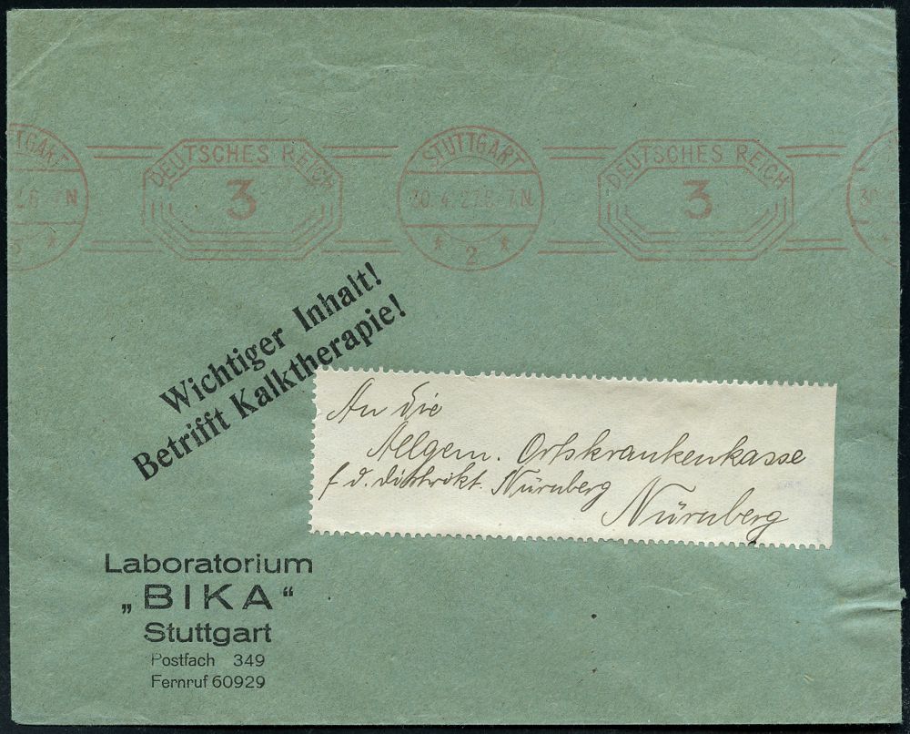 3476 | 8 € | 7000 Stuttgart Maschinen-Postfreistempel : STUTTGART/ *2*/ DEUTSCHES REICH 1927 (30.4.) Band-PFS "Achteck" mit 2x 2 Strichen auf Firmen-Bf.: Laboratorium "BIKA".. (Dü.C-4, Nr.154 , nur in Württembg. verwendet) | ![]() | |