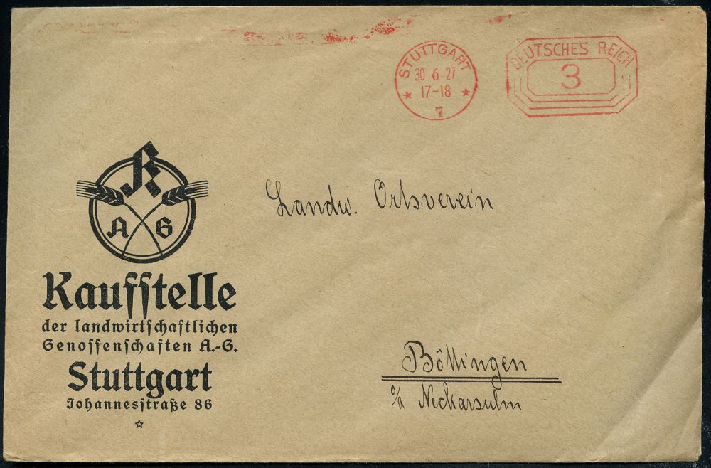 3477 | 10 € | 7000 Stuttgart Maschinen-Postfreistempel : STUTTGART/ *7*/ DEUTSCHES REICH 1927 (30.6.) PFS "Achteck" 3 Pf. auf Vordruck-Bf.: Kaufstelle der landwirtschaftl. Genossenschaften AG. mit Logo (Dü.D-4) | ![]() | |