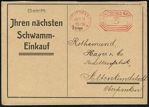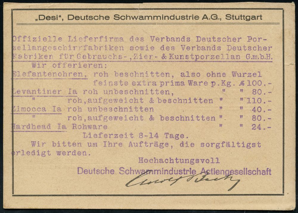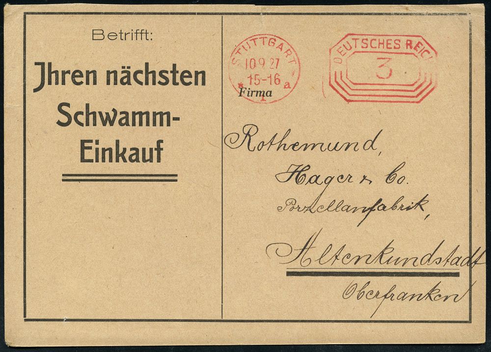 3478 | 12 € | 7000 Stuttgart Maschinen-Postfreistempel : STUTTGART/ *1a/ DEUTSCHES REICH 1927 (10.9.) PFS "Achteck" 3 Pf. auf Firmen-Kt.: "Desi" Deutsche Schwammindustrie AG (Schwämme für keramische Industrie) mit Preisen (Dü.D-4) | ![]() ![]() | |