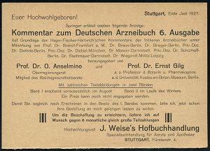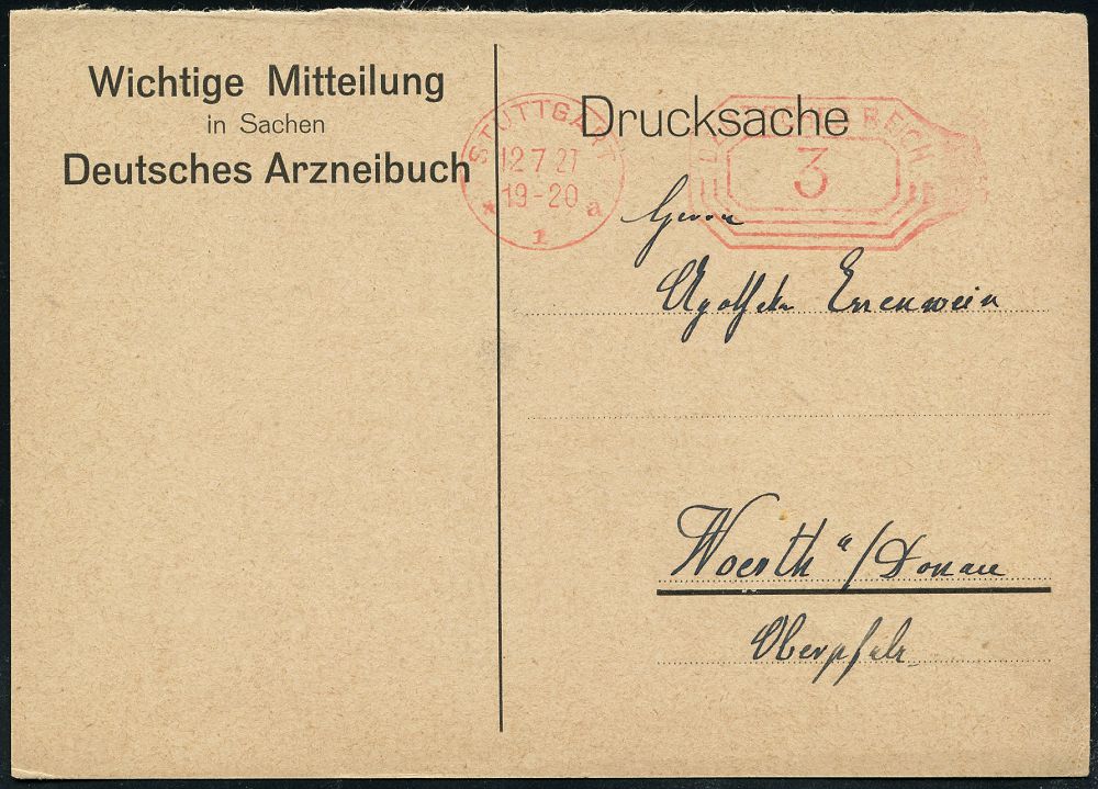 3479 | 10 € | 7000 Stuttgart Maschinen-Postfreistempel : STUTTGART/ *1a/ DEUTSCHES REICH 1927 (12.7.) PFS 3 Pf. auf (halber) Reklame-Kt.: Deutsches Arzneibuch.. J. Weise´s Hofbuchhandlung (Dü.D-4) | ![]() ![]() | |