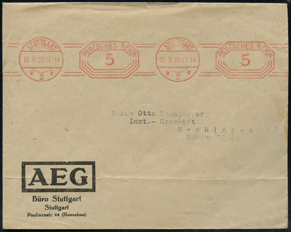 3480 | 15 € | 7000 Stuttgart Maschinen-Postfreistempel : STUTTGART/ *2*/ DEUTSCHES REICH 1928 (22.9.) Band-PFS "Achteck" 5 Pf. mit 2x 2 Linien auf Firmen-Bf.: ARG.. mit rs. Reklame: AEG Schmiedefeuergebläse (schwache Querfalte) n. Hechingen (Dü.C-4, Nr.154, nur in Württembg.) | ![]() ![]() | |