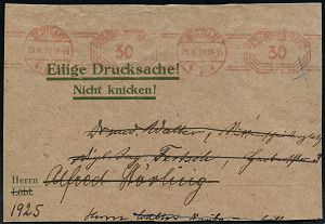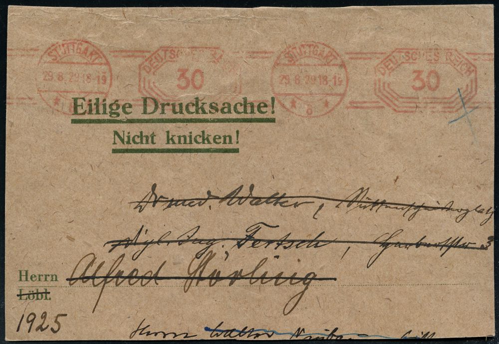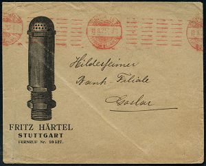 3467 | 25 € | 7000 Stuttgart Maschinen-Postfreistempel : STUTTGART Nr.2/ FRANKO BEZAHLT 1923 (18.8.) seltener Infla-Band-Maschinen-PFS ohne Wertangabe mit 4x 7 kurzen Strichen (Typ Krag) auf Reklame-Bf.: FRITZ HÄRTEL.. (schwache Eckfalte) mit techn. Objekt (Dü.C-2, Nr.32) | ![]() | |