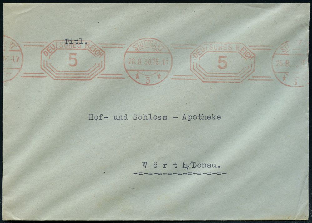 3481 | 15 € | 7000 Stuttgart Maschinen-Postfreistempel : STUTTGART/ *8*/ DEUTSCHES REICH 1929 (29.8.) Band-PFS "Achteck" 30 Pf. mit 2 x 2 Linie auf Teil-Vorderseite, seltene Portostufe! (Dü.C-4, Nr.154) | ![]() | |
