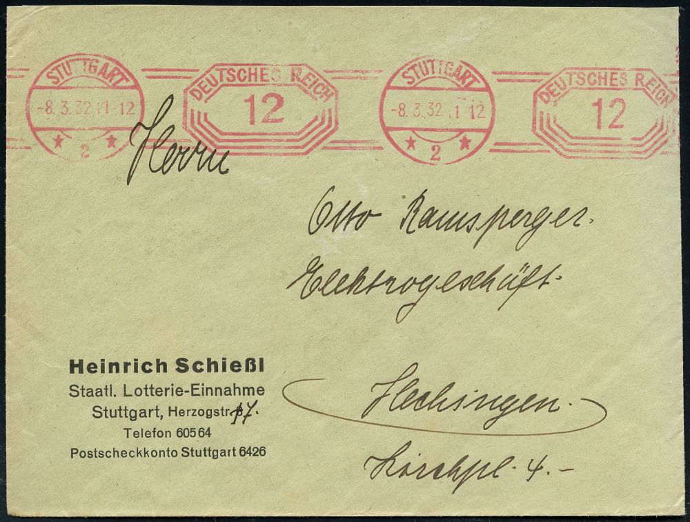 3485 | 8 € | 7000 Stuttgart Maschinen-Postfreistempel : STUTTGART/ *2*/ DEUTSCHES REICH 1932 (8.3.) Band-PFS "Achteck" 12 Pf. mit 2 x 2 waager. Linien auf Firmen-Bf.: Heinr. Schießl, Staatl. Lotterie-Einnahme.. (Dü.C-4, Nr.154, nur in Württembg.) | ![]() | |