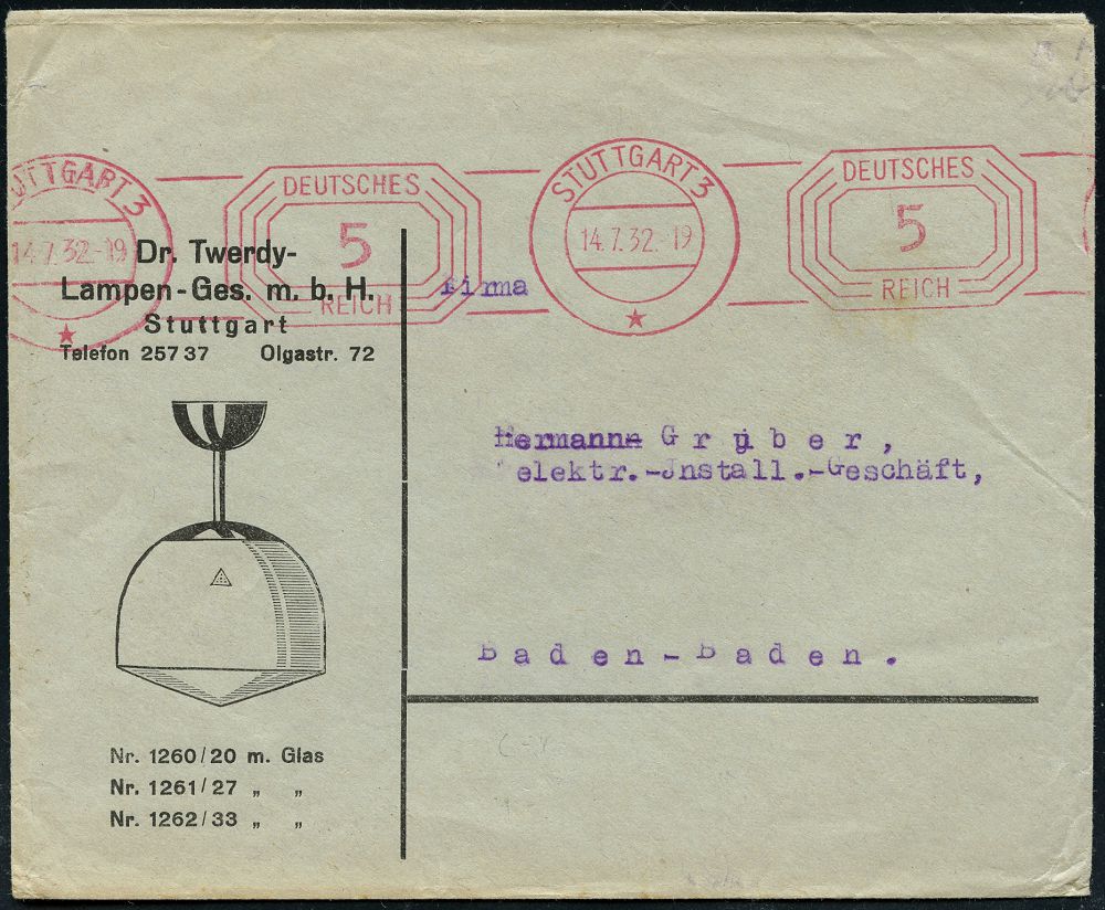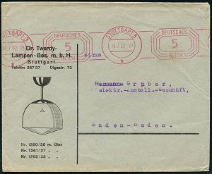 3486 | 14 € | 7000 Stuttgart Maschinen-Postfreistempel : STUTTGAR 3/ */ DEUTSCHES/ REICH 1932 (14.7.) Band-PFS "Achteck" 5 Pf., Inschrift zweizeilig auf Reklame-Bf.: Dr. Twerdy-Lampen-GmbH mit Glaslampe (Dü.C-5, Nr.158, nur in Württembg.) | ![]() | |