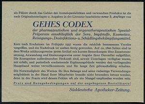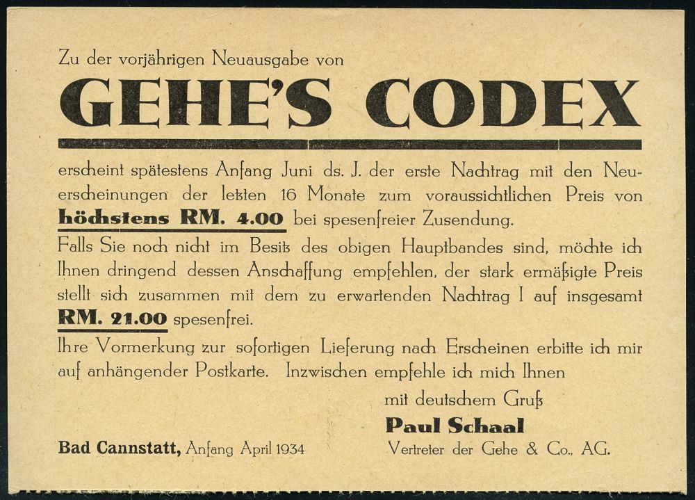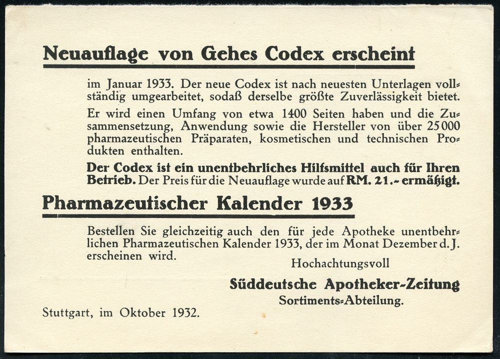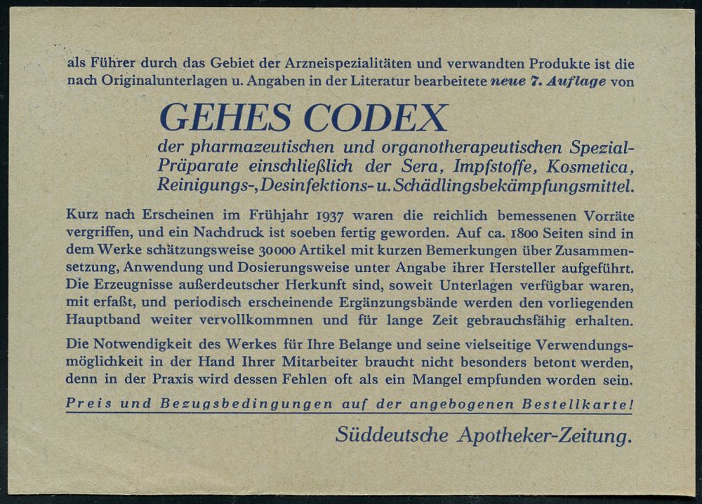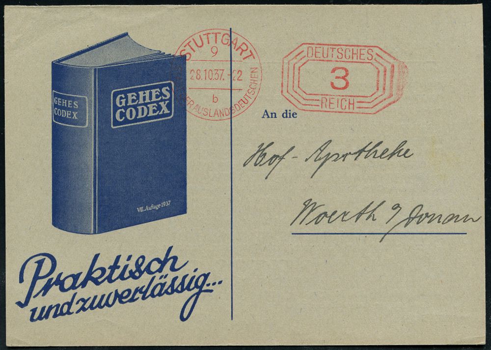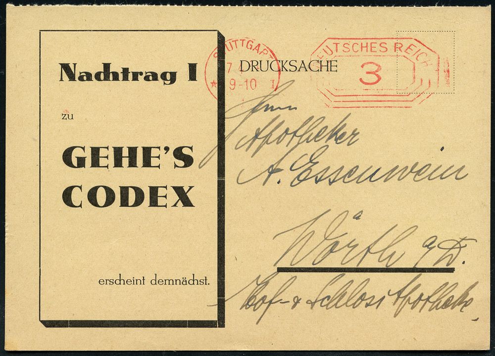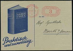 3493 | 10 € | 7000 Stuttgart Maschinen-Postfreistempel : STUTTGART/ *1I/ DEUTSCHES REICH 1934 (7.4.) PFS "Achteck" einzeilig, 3 Pf. auf (halber) Reklame-Kt.: GEHE´S CODEX.. Paul Schaal, Gehe & Co. (Dü.D-4) | ![]() ![]() | |