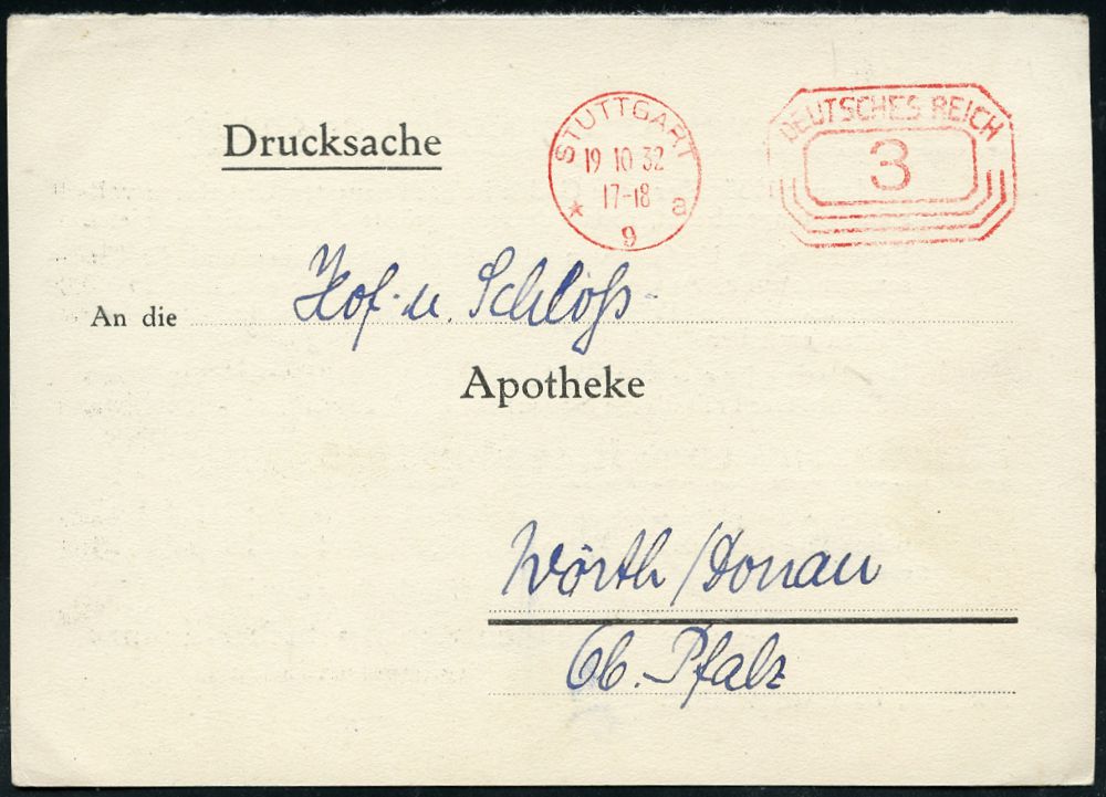 3487 | 10 € | 7000 Stuttgart Maschinen-Postfreistempel : STUTTGART/ *9a/ DEUTSCHES REICH 1932 (19.10.) PFS "Achteck" 3 Pf. auf (halber) Reklame-Kt.: Süddeutsche Apotheker-Zeitung (Gehes Codex) (Dü.D-4) | ![]() ![]() | |