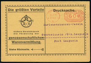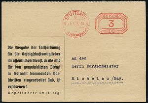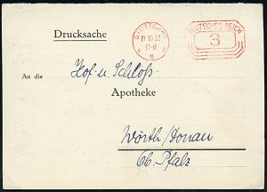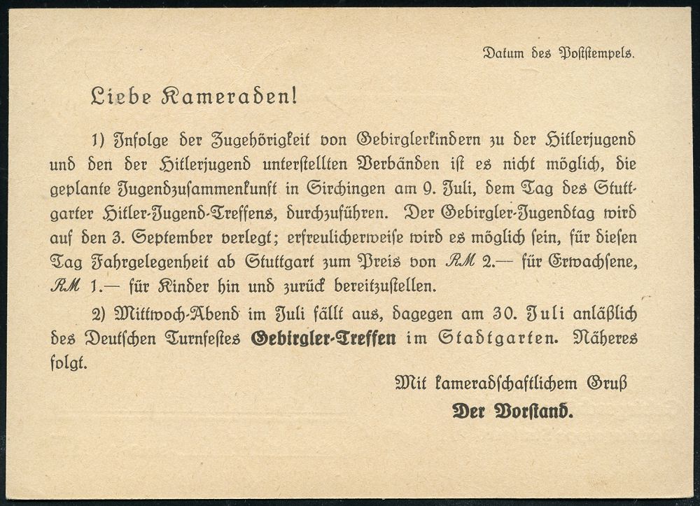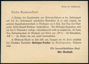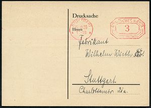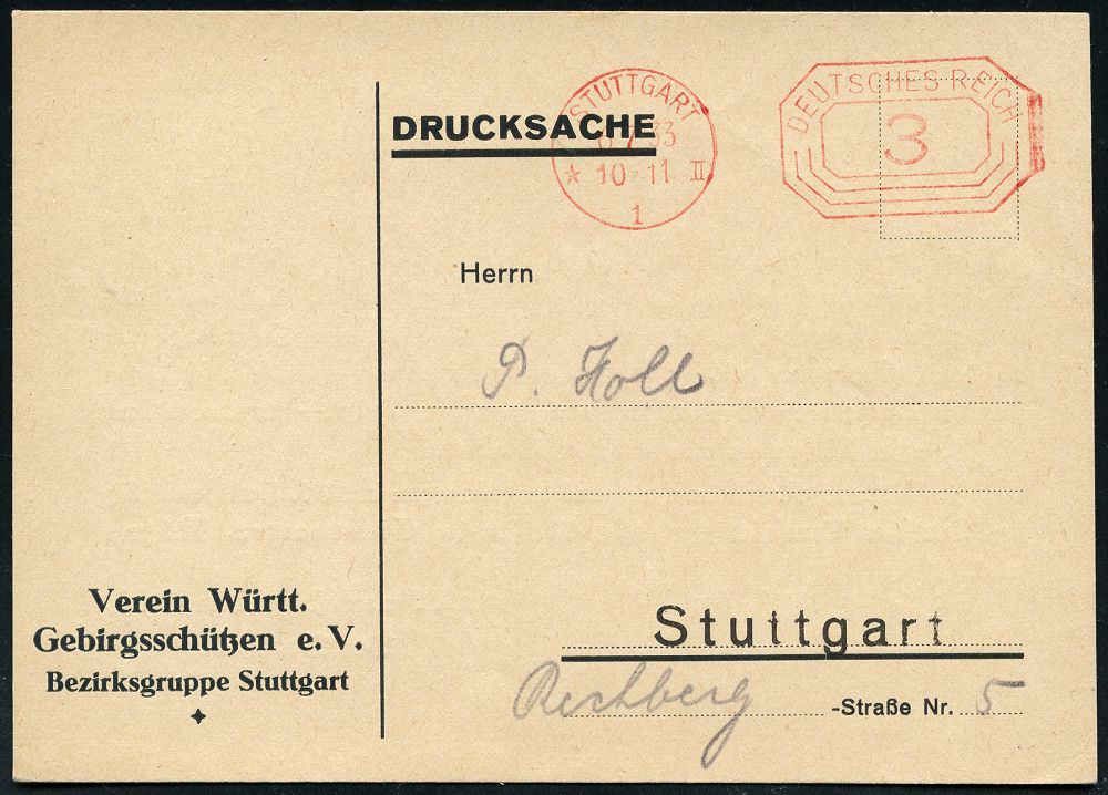 3491 | 18 € | 7000 Stuttgart Maschinen-Postfreistempel : STUTTGART/ *1II/ DEUTSCHES REICH 1933 (6.7.) PFS 3 Pf. "Achteck" einzeilig auf Vordruck-Kt.: Verein Württ. Gebirgsschützen e.V. mit Text zur Zugehörigkeit der Gebirgsjugend zur Hitler-Jungend, seltene Beleg! (Dü.D-4) | ![]() ![]() | |