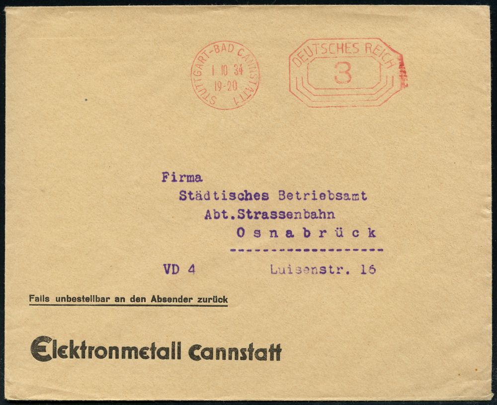 3495 | 8 € | 7000 Stuttgart Maschinen-Postfreistempel : STUTTGART-BAD CANNSTATT 1/ DEUTSCHES REICH 1934 (1.10.) PFS "Achteck" einzeilig, 3 Pf. auf Firmen-Bf.: Elektrometall Cannstatt (Dü.E-4) | ![]() | |