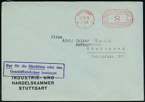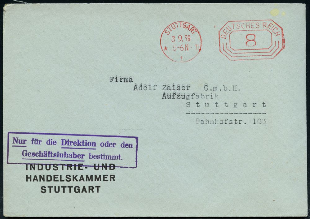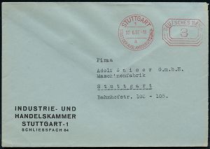 3498 | 8 € | 7000 Stuttgart Maschinen-Postfreistempel : STUTTGART/ *1II/ DEUTSCHES REICH 1936 (3.9.) PFS "Achteck" einzeilig, 8 Pf. auf Dienst-Bf.: INDUSTRIE- U. HANDELSKAMMER MIT Zusatzstempel, Orts-Bf. (Dü.D-4) | ![]() | |